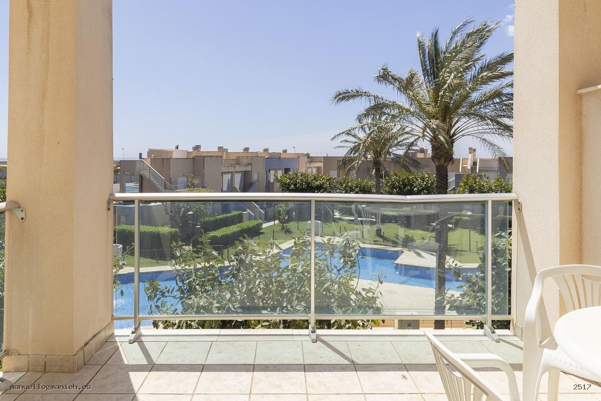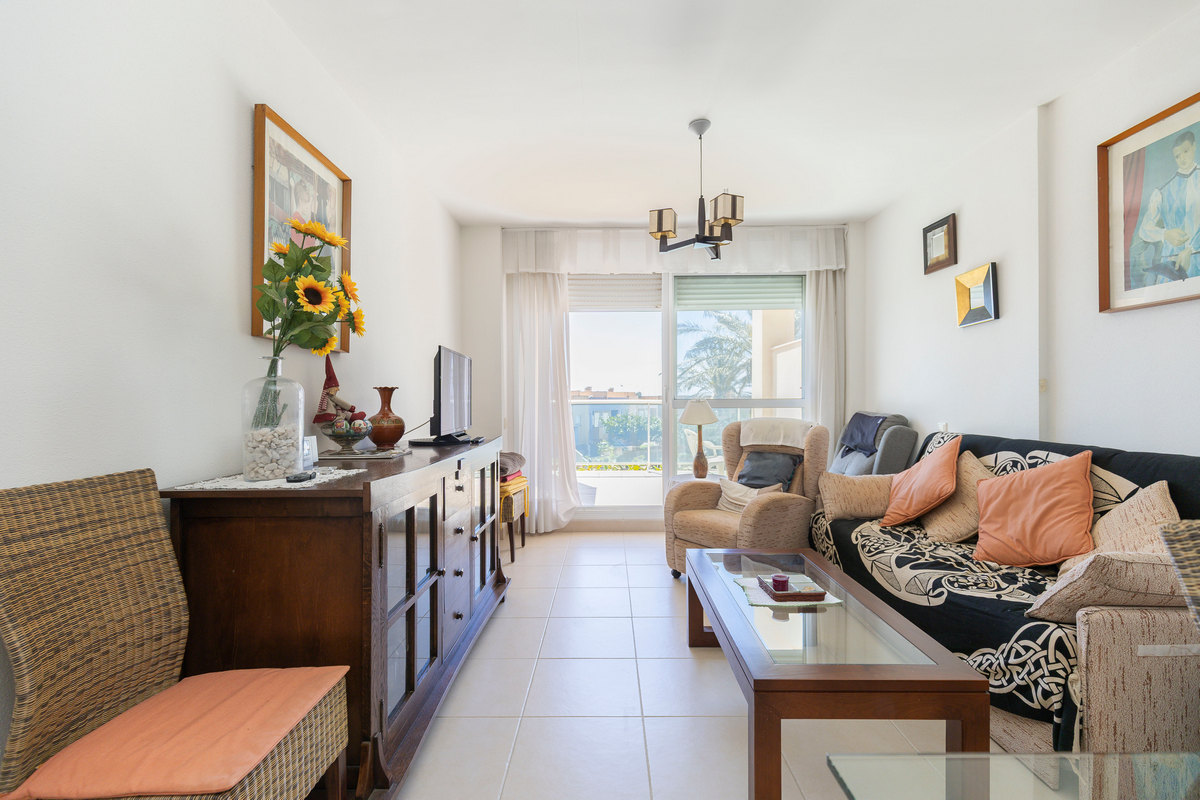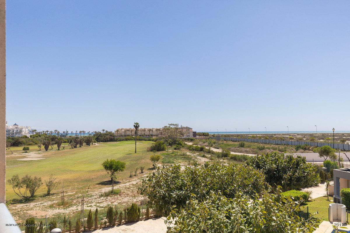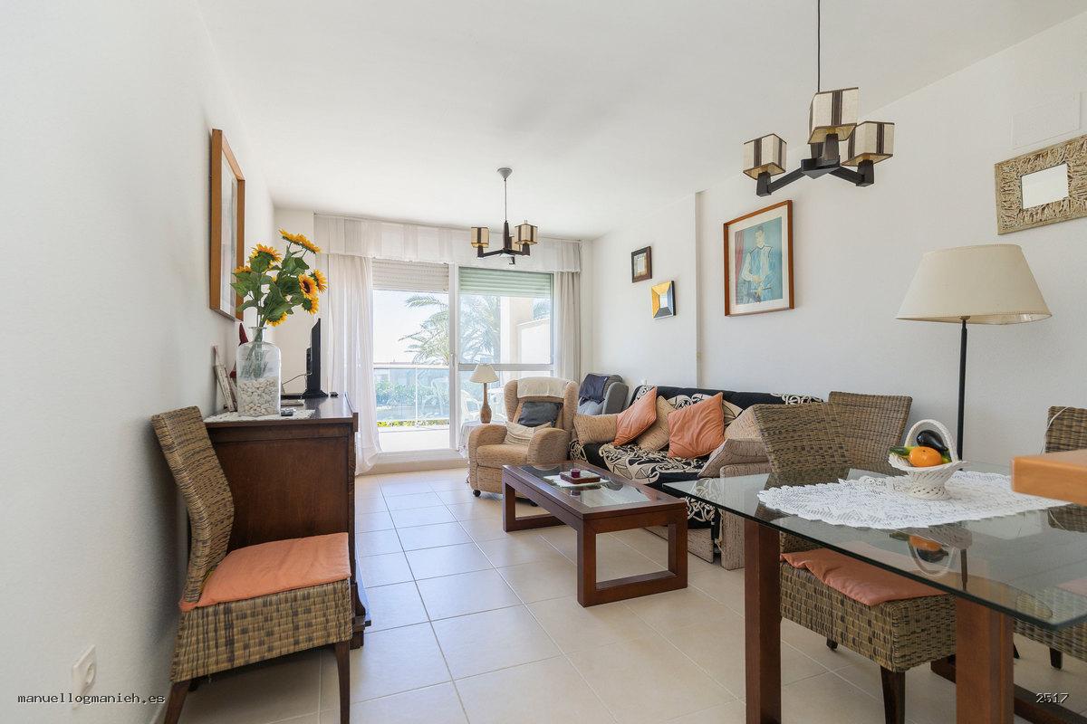 Sofort bezugsfertig! Zum Verkauf steht eine gemütliche Eigentumswohnung im zweiten Stock mit Aufzug. Die Wohnung verfügt über eine bebaute Fläche von 104 m² und eine großzügige Terrasse mit teilweiseem Blick auf den Strand und den Golfplatz. Die Aufteilung umfasst: Eingangsbereich, Flur, Wohn-Esszimmer mit direktem Zugang zur Terrasse, moderne, komplett eingerichtete und ausgestattete Einbauküche, zwei Schlafzimmer mit Einbauschränken und zwei Badezimmer. Das Hauptschlafzimmer verfügt über ein eigenes Bad. Hervorragende Bauqualität und erstklassige Ausstattung, Klimaanlage (kühlen und heizen), doppelt verglaste Fenster, Video-Gegensprechanlage und gepanzerte Eingangstür. Die Wohnung wird komplett möbliert verkauft und beinhaltet einen Parkplatz.