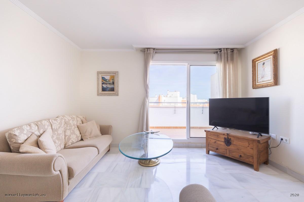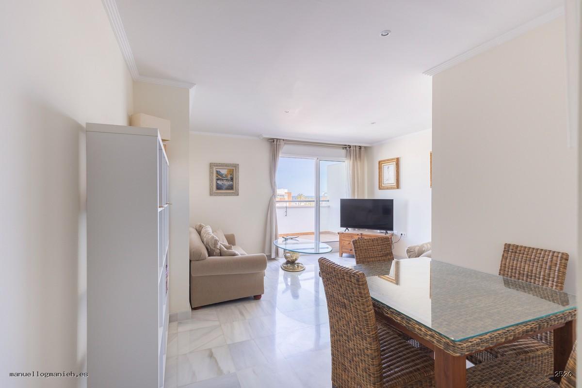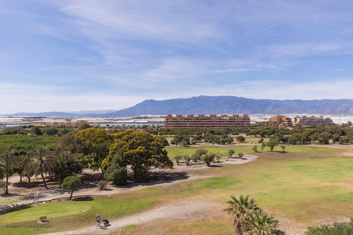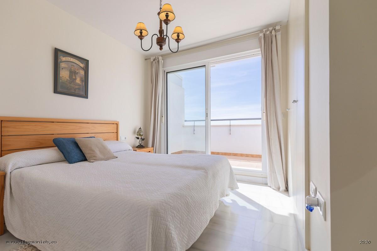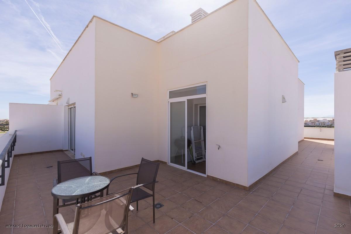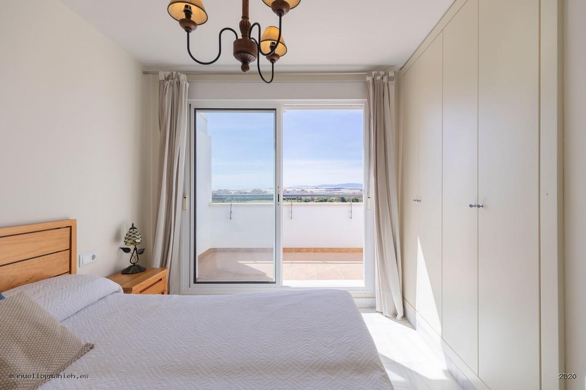 A la venta luminosa propiedad con vistas al campo de golf, situada en una cuarta planta con ascensor. Se trata de un ático con una superficie construida de 97 m² y 82 m² útiles, que destaca por su amplitud, distribución y calidad de construcción. Incluye el uso y disfrute exclusivo de una magnífica terraza de 64 m² con espectaculares vistas. El interior de la vivienda se distribuye en recibidor, amplio salón-comedor, cocina totalmente amueblada y equipada, lavadero, dos dormitorios con armarios empotrados y dos baños completos, uno de ellos en suite. Entre sus calidades destacan: suelos de mármol, ventanas de doble acristalamiento, videoportero, puerta blindada y sistema de aire acondicionado. Se vende amueblada e incluye plaza de garaje y trastero en la planta sótano.