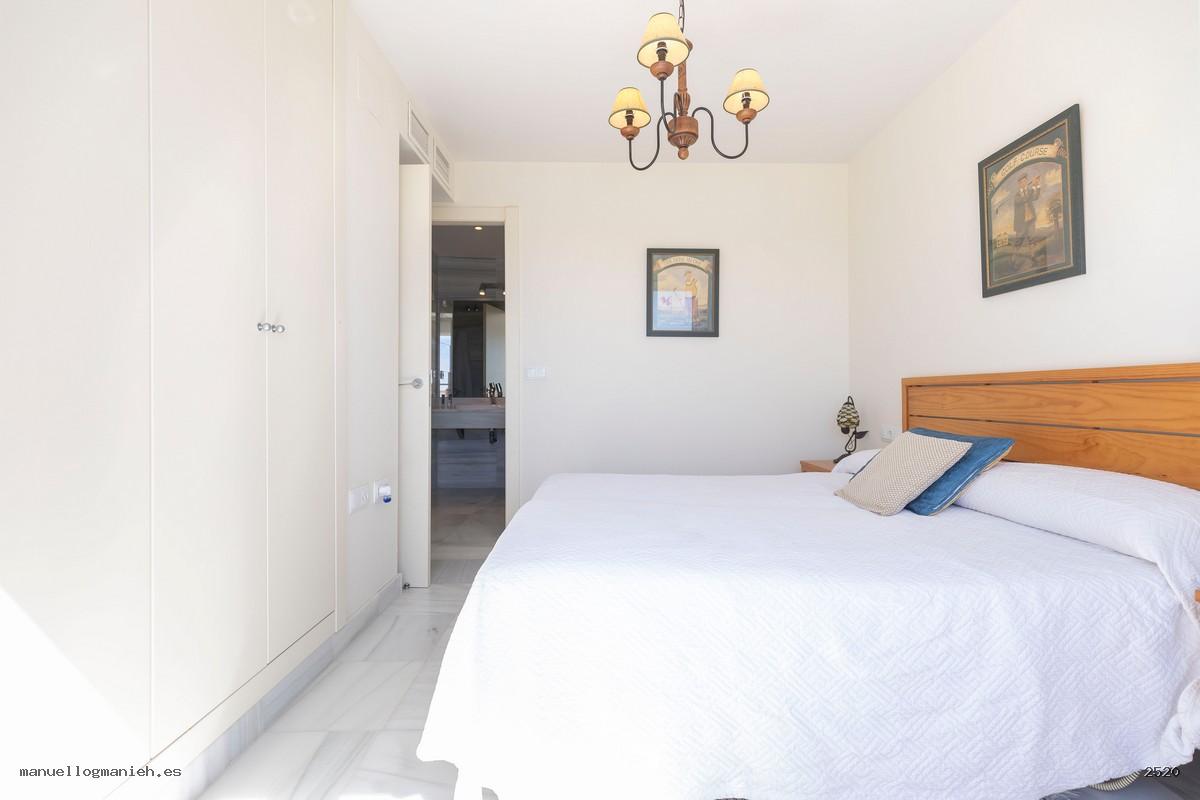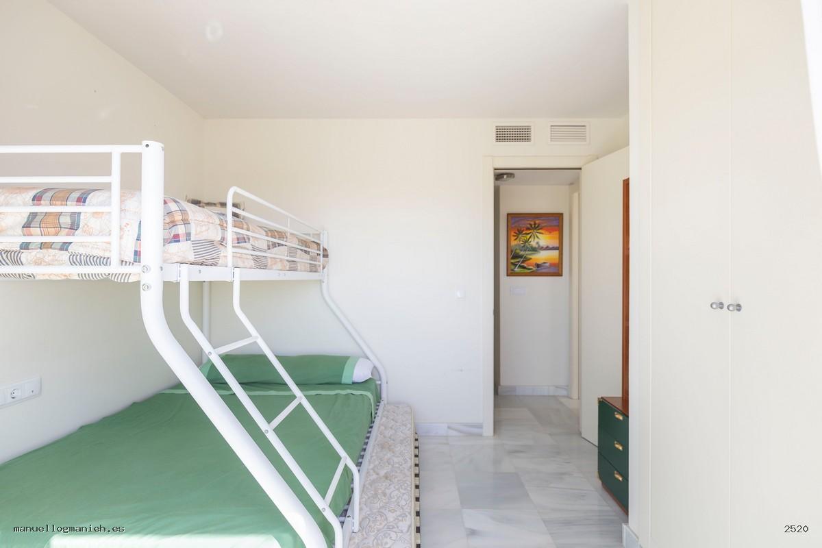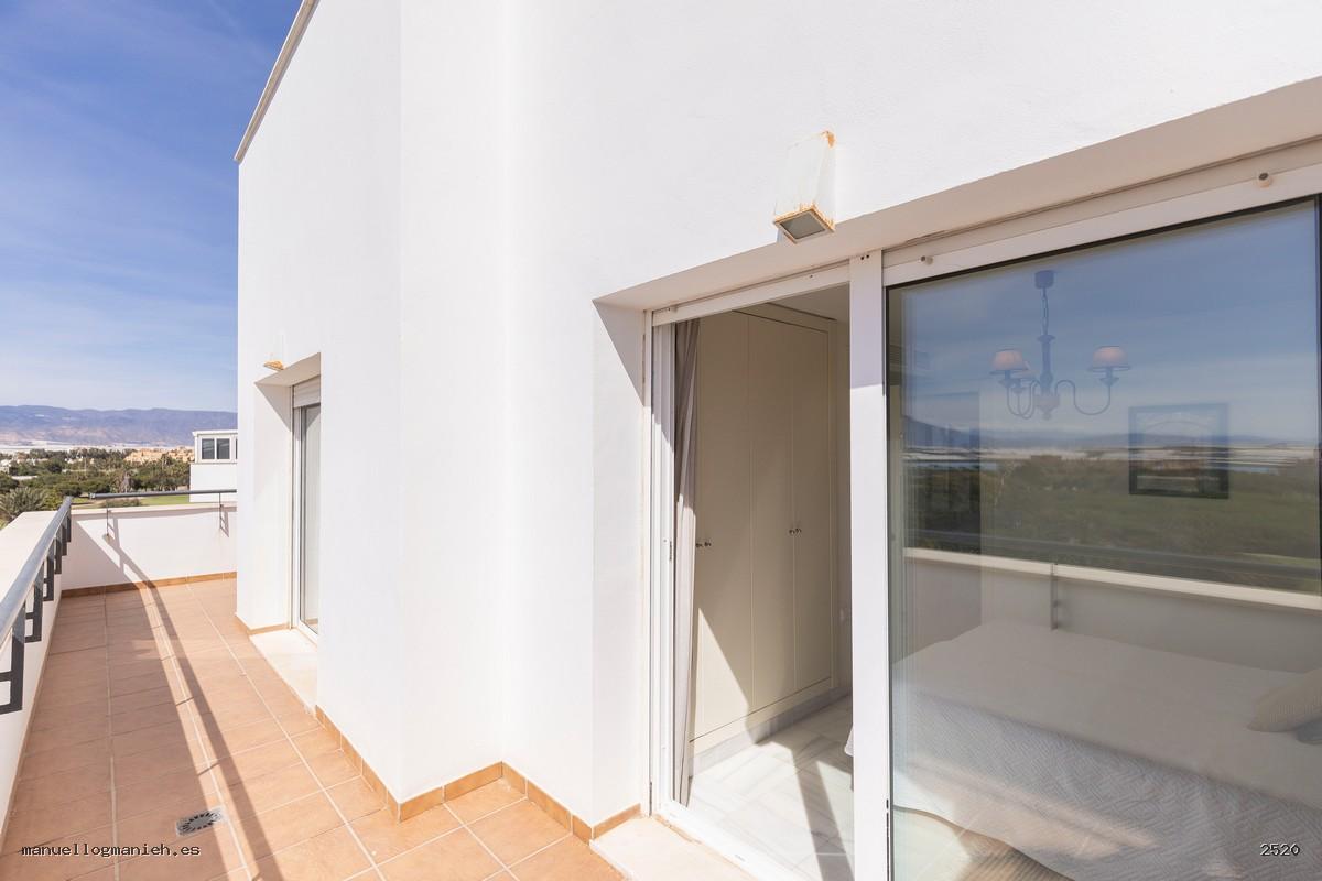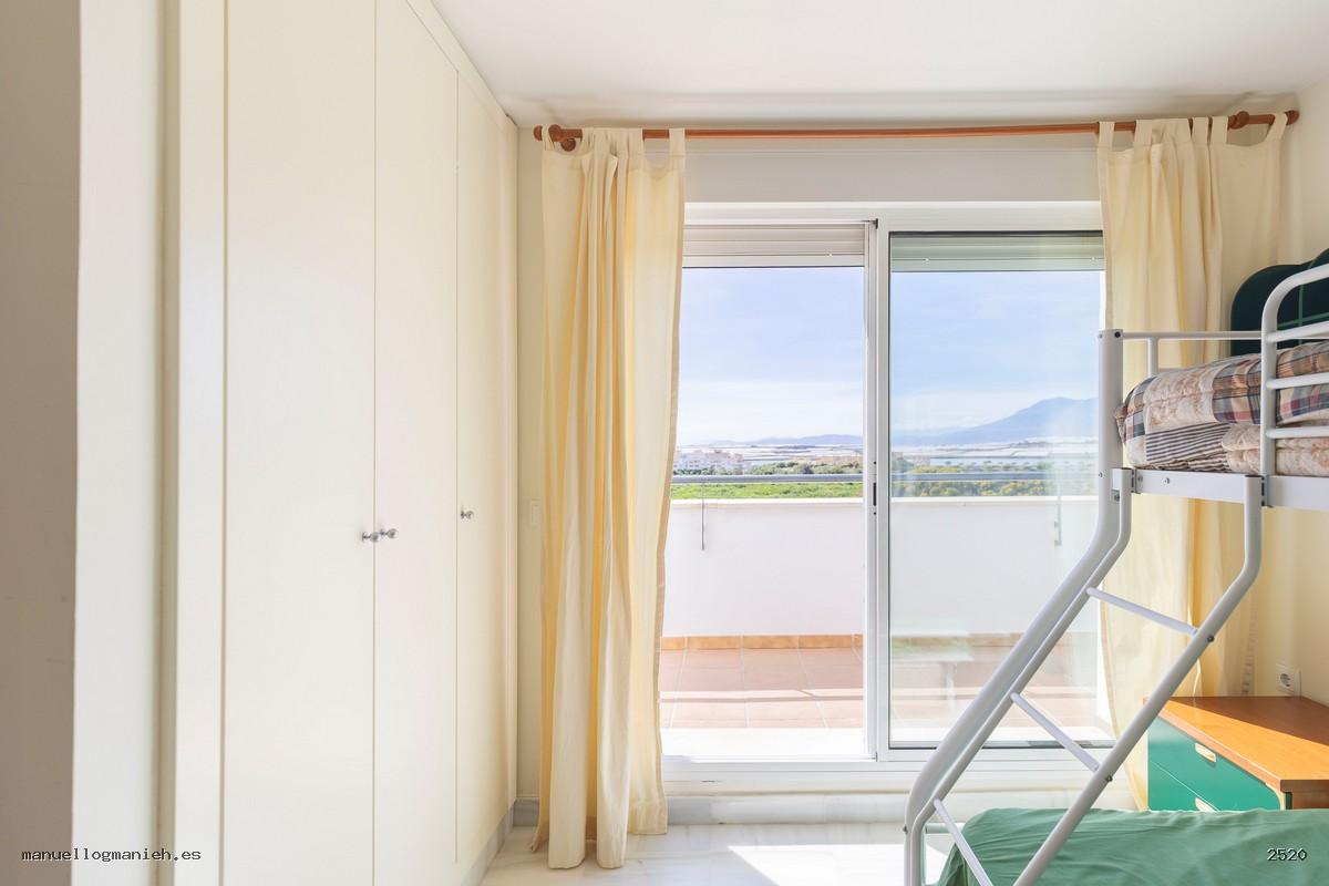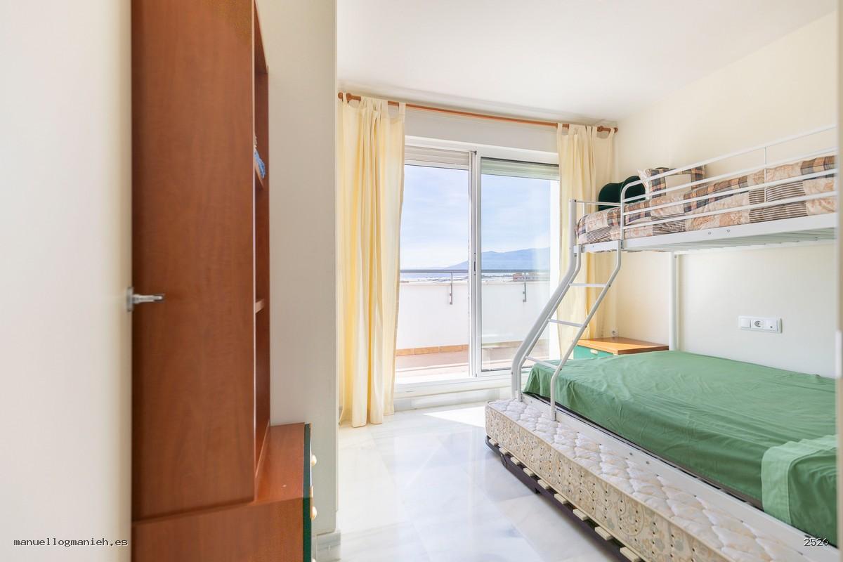 A la venta luminosa propiedad con vistas al campo de golf, situada en una cuarta planta con ascensor. Se trata de un ático con una superficie construida de 97 m² y 82 m² útiles, que destaca por su amplitud, distribución y calidad de construcción. Incluye el uso y disfrute exclusivo de una magnífica terraza de 64 m² con espectaculares vistas. El interior de la vivienda se distribuye en recibidor, amplio salón-comedor, cocina totalmente amueblada y equipada, lavadero, dos dormitorios con armarios empotrados y dos baños completos, uno de ellos en suite. Entre sus calidades destacan: suelos de mármol, ventanas de doble acristalamiento, videoportero, puerta blindada y sistema de aire acondicionado. Se vende amueblada e incluye plaza de garaje y trastero en la planta sótano.